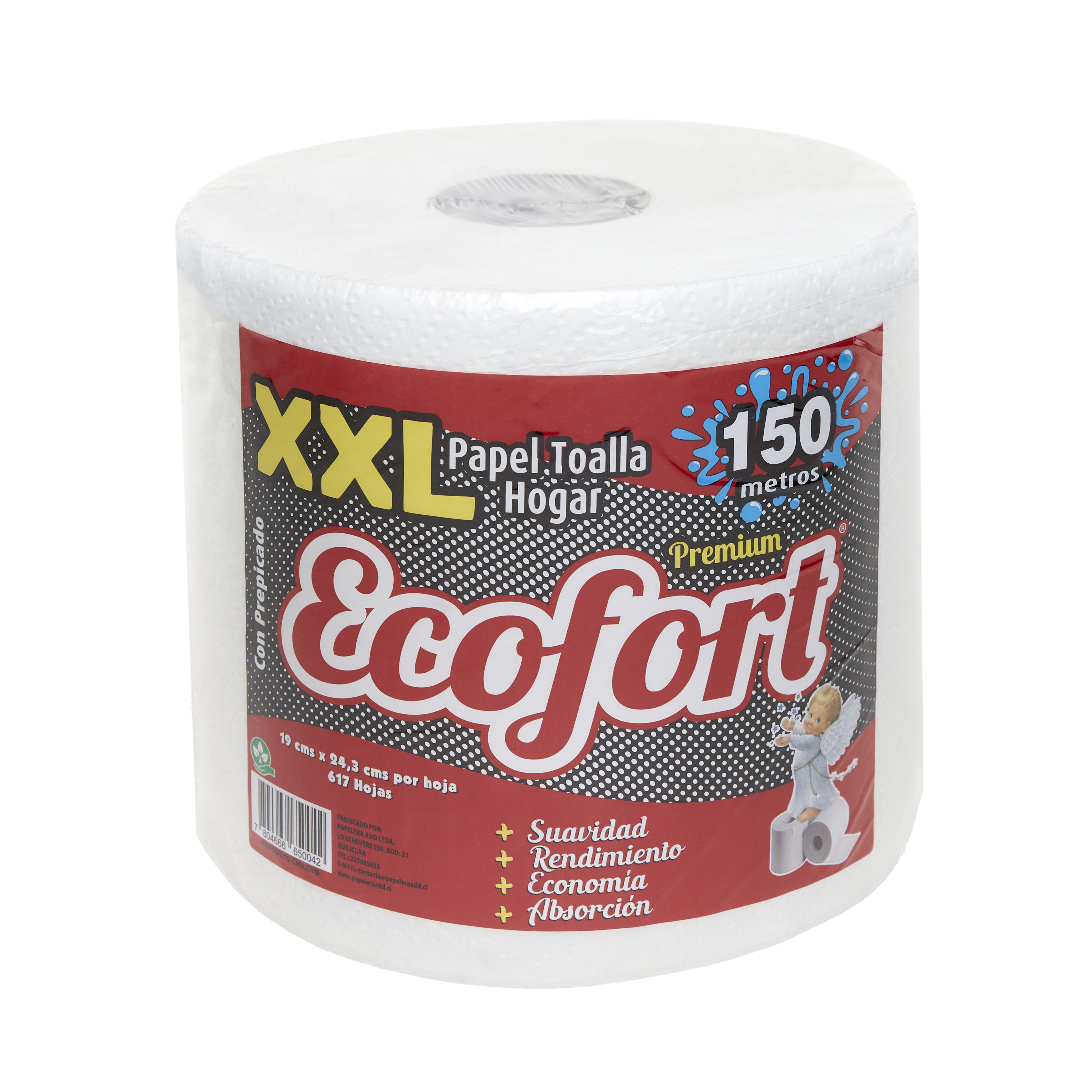 Papel Toalla Ecofort XXL 150 de 28 grs celulosa virgen con prepicado, ultra pack x 1), en bolsón absorbente en contenedor de 10 rollos.