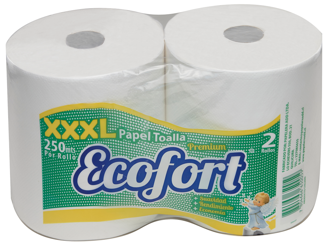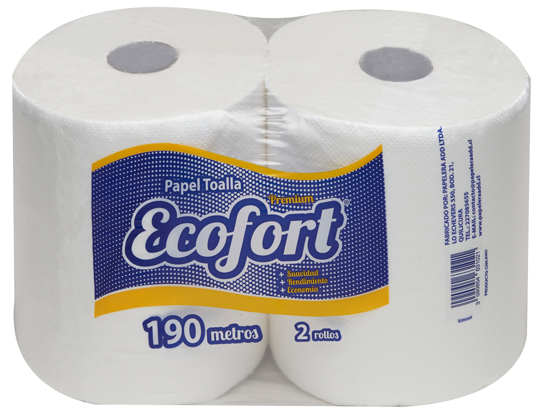 Papel Toalla Ecofort 190 (pack x2), con 28 grs de celulosa virgen ultra absorbente para dispensadores palanca y auto corte.
