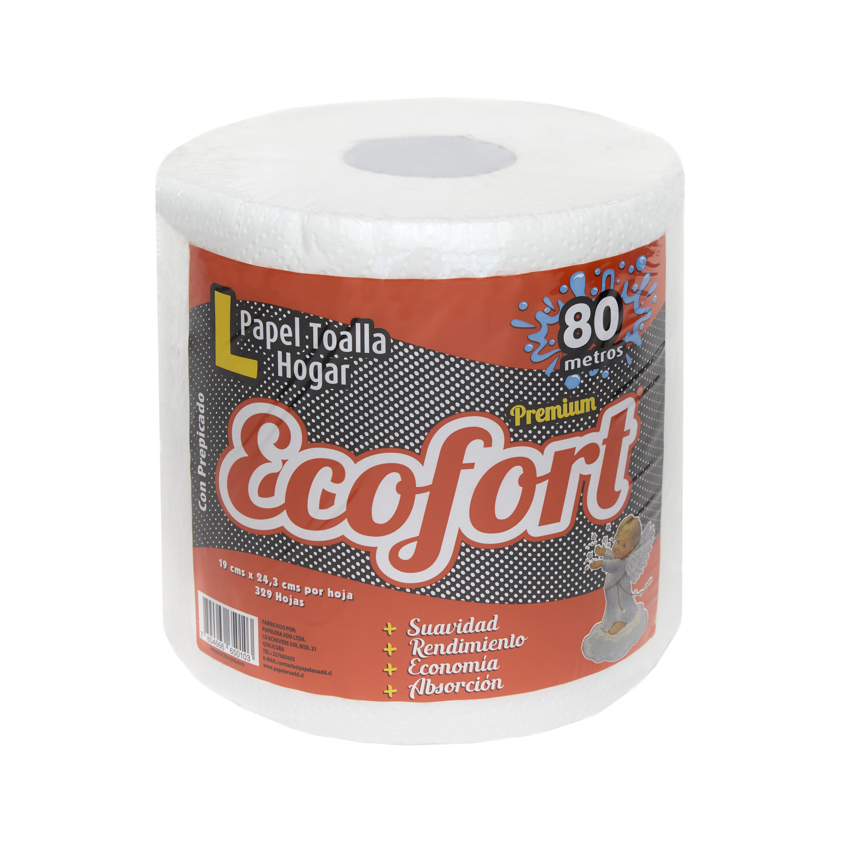 Papel Toalla Ecofort L 80 Premium Una Hoja, 28 grs celulosa virgen con prepicado, 19cm ultra absorbente en (pack X1), en bolsón contenedor de 10 rollos.